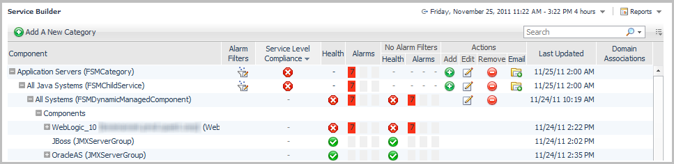 A component has its own alarms and Service Level Compliance (availability) status. The status of each component rolls up to provide an overall Service Level Compliance and alarm status for a service. From the Service Builder dashboard, you can explore how a service is built. You may want to examine this composition to see which components are contributing to the poor health.