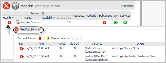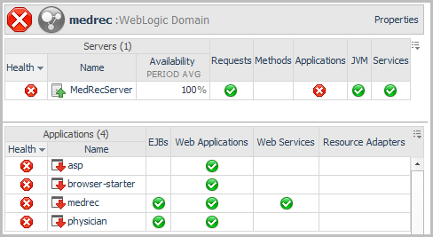 For example, the health of a WebLogic_10 system is poor (), because one server and six applications are unavailable (). Click the status icon for an affected component (system, server, or application) to obtain information about the source. For more information, see Reviewing the health of your systems.