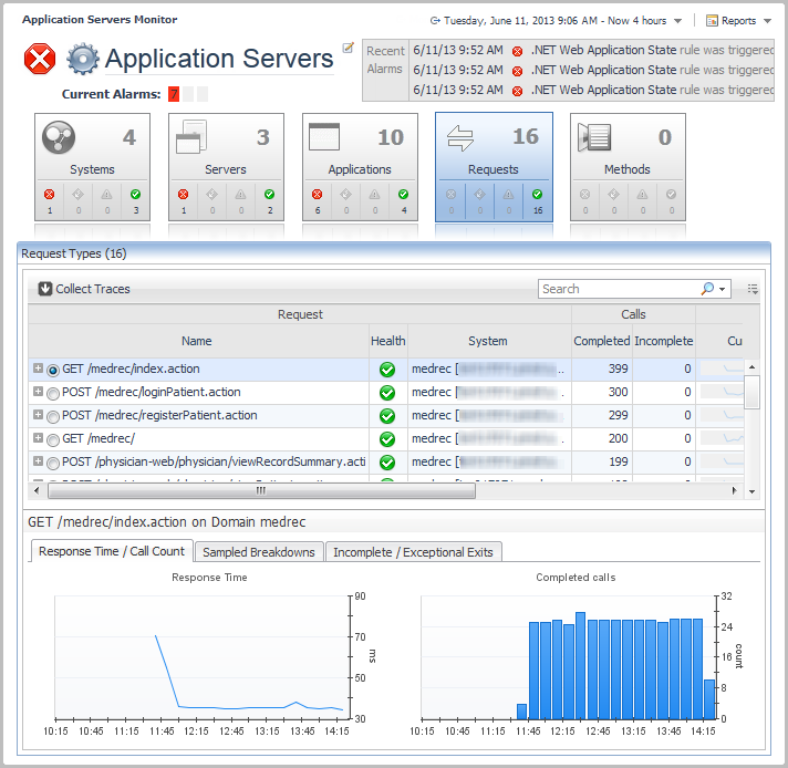 The Application Servers Monitor dashboard includes predefined views for monitoring and investigating alarms associated with service requests made to your applications. Use the Requests view to investigate unique request types, such as requests made through HTTP, JMS, RMI, or JNDI, and to access full details of those request types. In addition, this interface allows you to investigate single traces in full detail or at component detail to assist you in localizing a potential trouble spot.
