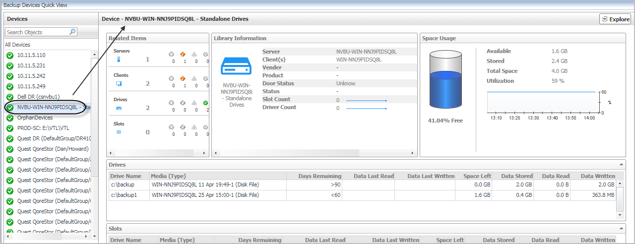 Related Items: Shows the number of Servers/Clients/Drivers/Slots that are affiliated with this NetVault Backup Device.