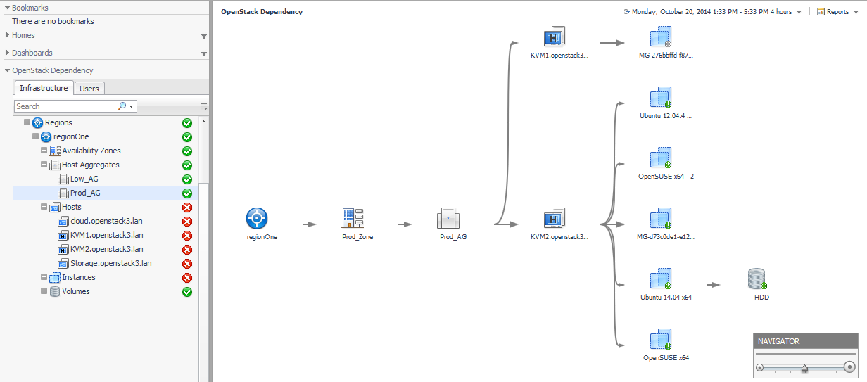 In the preceding dashboard, KVM1 and KVM2 are computer nodes running a hypervisor. cloud and Storage are controller nodes running scheduling and storage services respectively.
