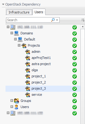Like the Infrastructure tab, this tab also displays the monitored OpenStack environment as the root of the navigation tree, showing Domains, Projects, Groups, and Users.