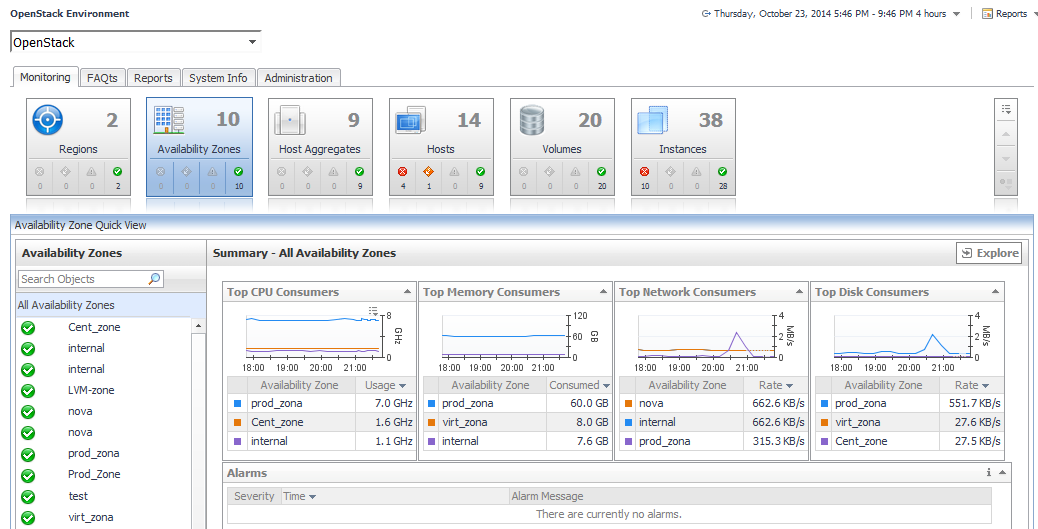 For more information about the data appearing on this dashboard, see Exploring the OpenStack Environment Monitoring tab .