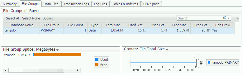 The File Groups table shows information about all file groups in the selected database. File stream types (used by memory optimized objects and file-stream objects) are now supported.