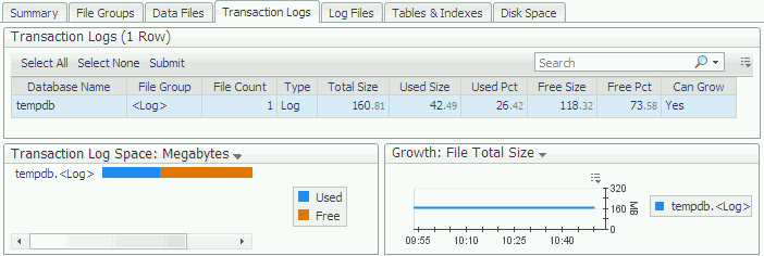 Use the Growth list to change the values displayed on the chart. This list can be displayed by the total amount of either all transaction logs (File Total Size), used logs database (File Used Size), or unused transaction logs (File Free Size).