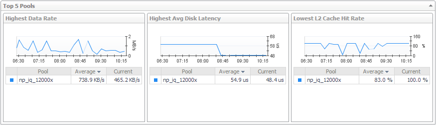 Top 5 Pools. Displays the top five pools with the highest average value for Data Rate and Latency, and the lowest average value for L2 Cache Hit Rate. The charts plot values over the time period, while the tables show the average and current values for each pool. |