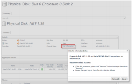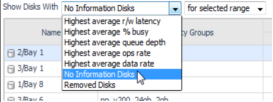 NOTE: Selecting "No Information Disks" metric from Show Disks With drop down shows the disks with no metrics provided by the Agent. Selecting "Removed Disks" metric from Show Disks With drop down shows the disks manually marked as "Removed" Physical State in No Information Dialog.