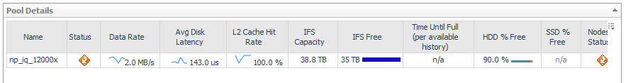 Pool Details (Arrays only). Displays performance and capacity metrics for the pools to which this disk contributes resources. For more information, see Performance Metrics and Capacity Metrics. To investigate a pool, click its name. For more information, see Investigating a Pool.