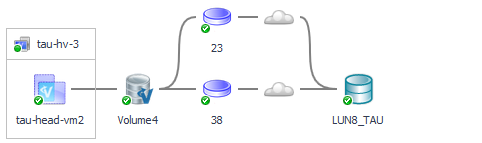 Click a Cloud icon to reveal the ports and paths from disks extents to the LUN, through a particular server. For more information, see Exploring Connectivity with SAN Topology Diagrams.