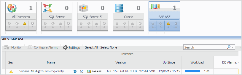 The table of database instances appearing just below the tile collection reflects the tile selection. For example, clicking the SAP ASE tile shows only the SAP ASE databases in the list.