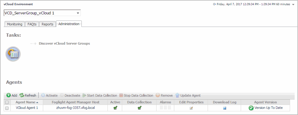 Foglight for vCloud Director uses the vCloud Director Agent to collect information from monitored hosts. Creating a vCloud Director Agent instance creates the agent process on the Agent Manager host. Activating the vCloud Director Agent starts that agent process. Starting an agent instance’s data collection enables the agent to start collecting data from the monitored host and to send it to the Management Server.