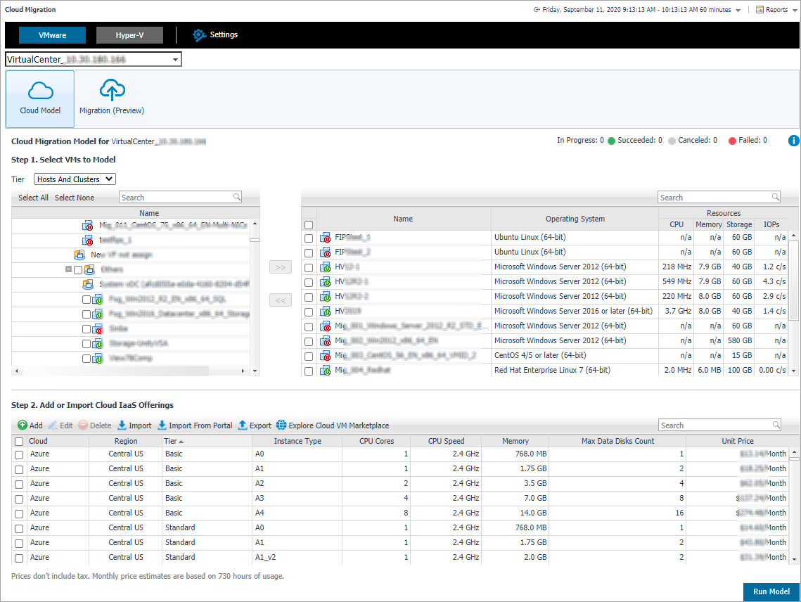 Foglight® for Cloud Migration supports Cloud Model for any cloud. It finds the best target cloud tiers for the virtual machines you selected, and adds the virtual machines to migration plan. After configured monitored Rapid Recovery core server and with an available Azure account, Foglight for Cloud Migration helps you to migrate the selected VMware virtual machines to Azure cloud.