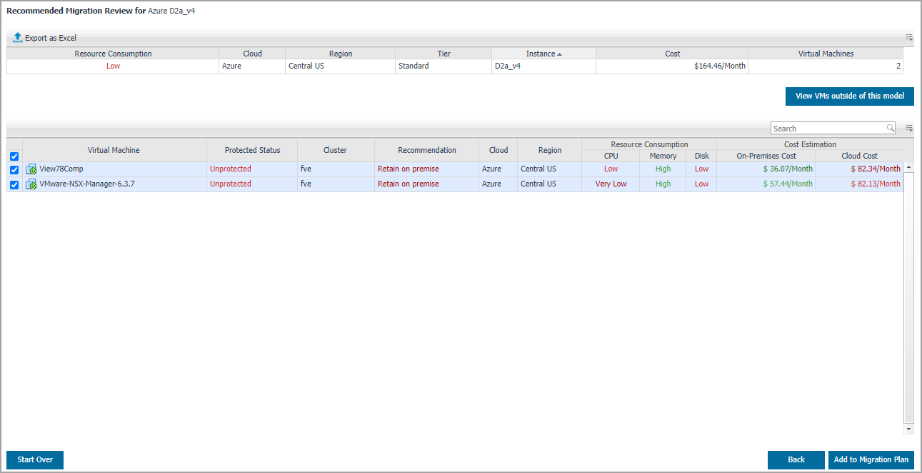 List by Instance Size view sorts the modeling VMs by different instance size. Clicking Review Model in Explore Outcome column, a Recommended Migration Review for the selected instance size view will be displayed.