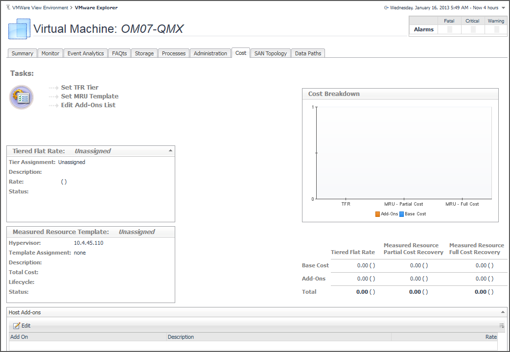 This tab is available in the VMware Explorer. To find it, open the VMware Explorer and on the Virtual Infrastructure view, that appears on the navigation panel, select a virtual machine instance. In the VMware Explorer, open the Cost tab.