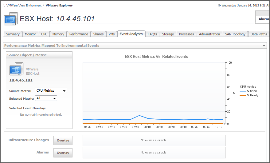 This view allows you to add events such as alarms or infrastructure changes as overlays to the ESX Host Metrics Vs. Related Events or VM Metrics Vs. Related Events view, and correlate the resource consumption with the stability of your environment.