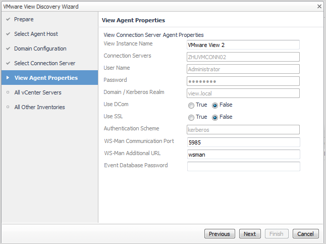 This workflow discovers the server information that is available in your View environment and automatically enters it into the Wizard screens. After running the Wizard, a Discovery Agent is created.