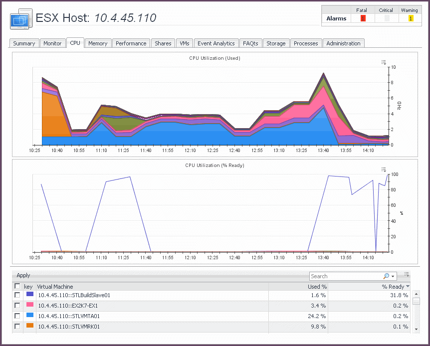 The VMware Explorer’s CPU tab displays the combined CPU utilization for an ESX host, showing the amount of processing speeds that are used by each virtual machine that is running on that host. This includes the amount of used processing speed, and the percentage of time the CPU resources are ready for use, all during a selected time period.