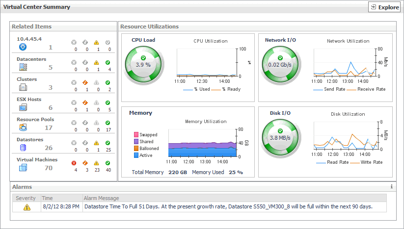 Virtual Machines. The number of virtual machines that belong to the selected virtual center, followed by the related alarm counts.