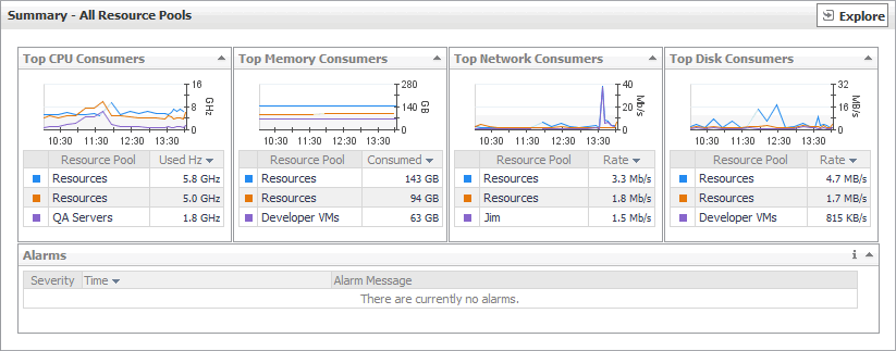 Resource Pools. The number of resource pools that belong to the selected virtual center, followed by the related alarm counts.