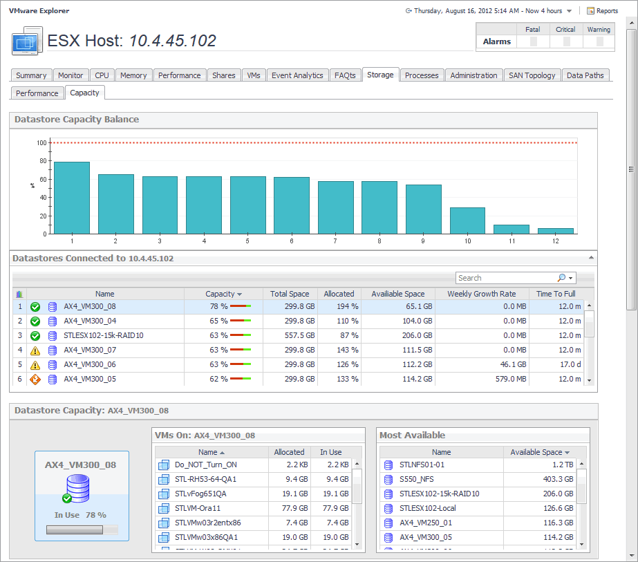 The Storage tab displays three tiles, identifying the datastores with the lowest amount of free space.