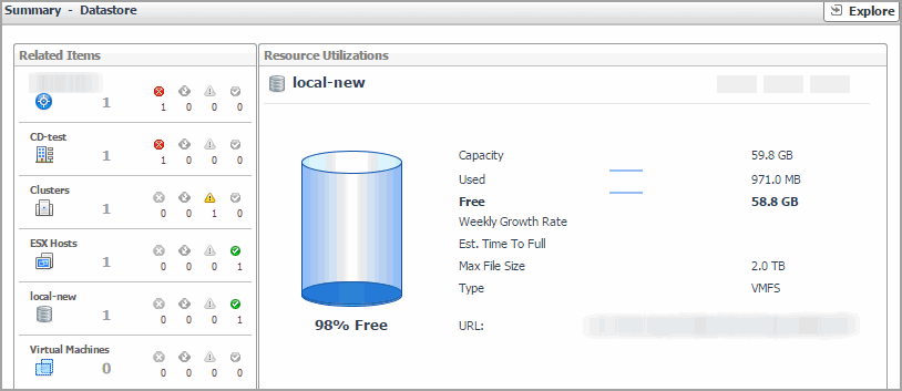On the VMware Environment dashboard, on the Monitoring tab, in the Virtual Environment Overview, select the Datastores tile. |