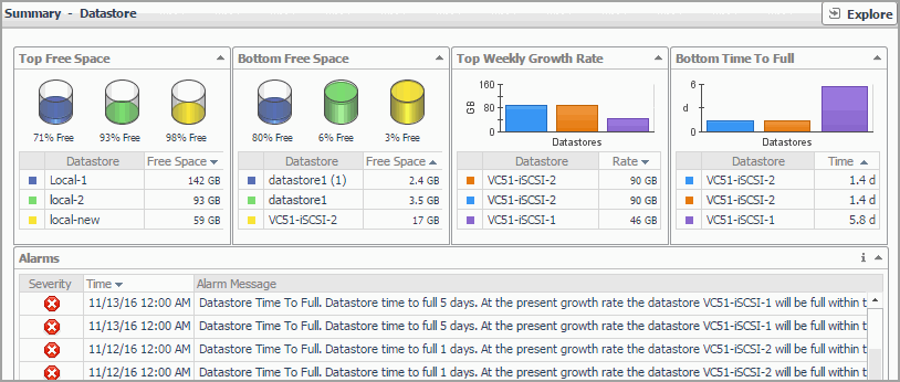 On the VMware Environment dashboard, on the Monitoring tab, in the Quick-View, select the Datastores tile. |