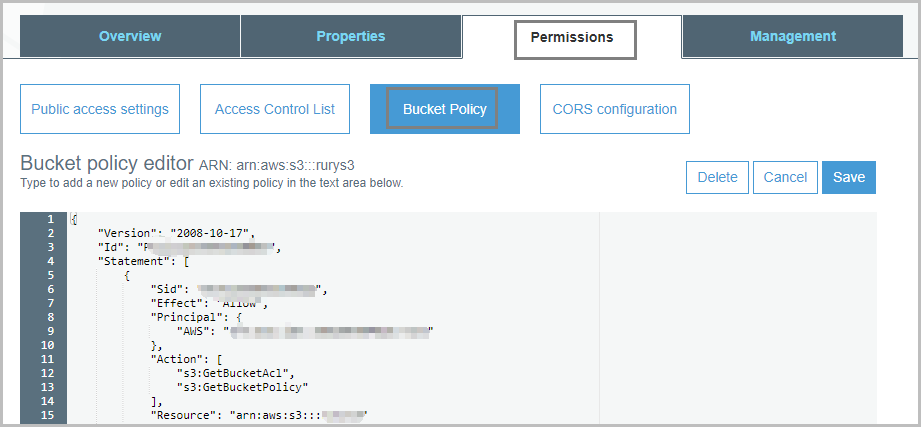 Open a new Page to access your S3 bucket, click Permissions and then Bucket policy. Paste the text in this sample policy into the permissions associated with your Amazon S3 bucket.