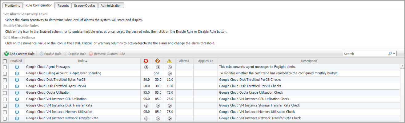 The Rule Configuration tab of the Cloud Manager dashboard contains links to rules and alarms tasks that you can use to manage Google Cloud rules and alarms.