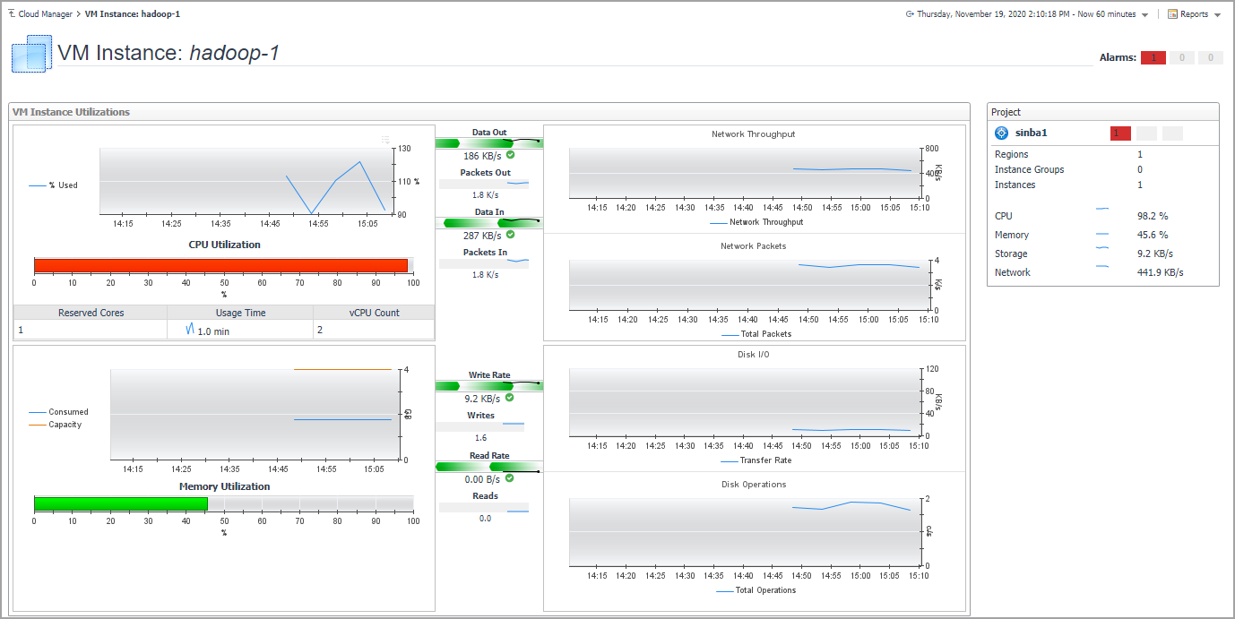 Resource Utilization: Shows the CPU Utilization, Network I/O, Memory Utilization, and Disk I/O for the selected VM instance.