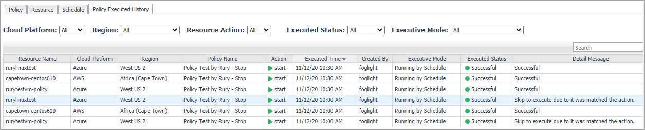 The Policy Executed History view shows the detailed history records of the executed policy by each Resource.