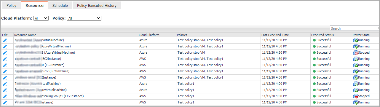 The Resource view shows all the VMs which are managed by the polices. Users can add resources to polices or remove resources from polices.
