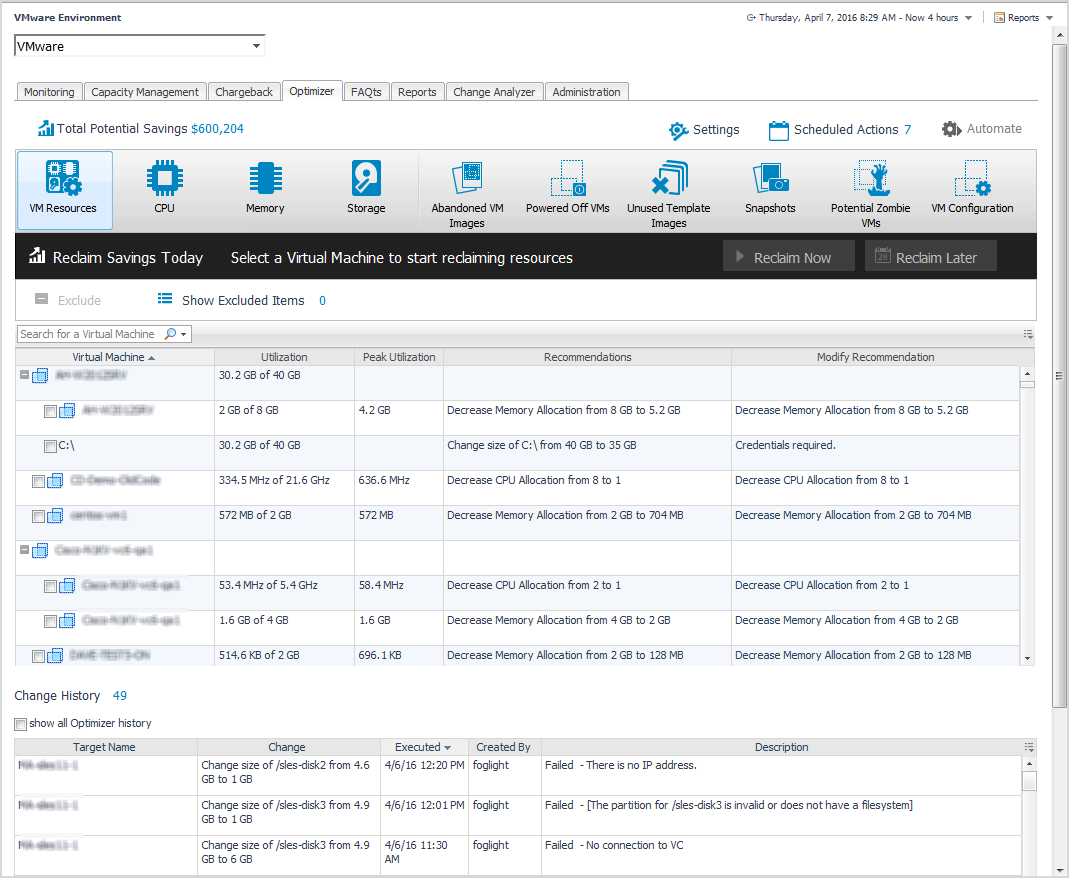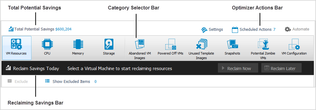 Total Potential Savings is the resource savings multiplied by the cost of the resource (“resource savings” x “the cost of the resource”). The Optimizer automatically calculates the savings for the selected VM object.