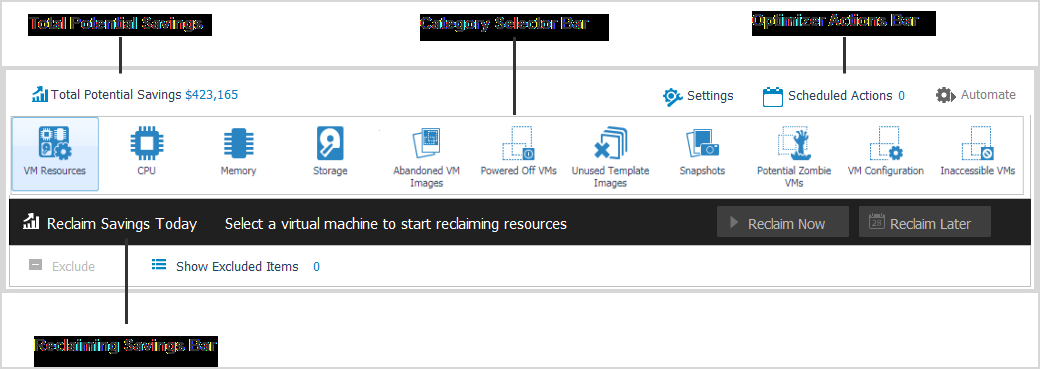 After selecting a group, use the Category Selector View to begin optimization of your virtual environment. This view contains the following sections: