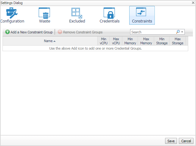 The Constraints tab allows you to set custom thresholds for select objects in the environment. These recommendations are displayed in the Optimizer tab > VM Configuration/ CPU/ Memory/ Storage views > Modify Recommendation column. Use this tab to add, edit, and remove constraints groups.