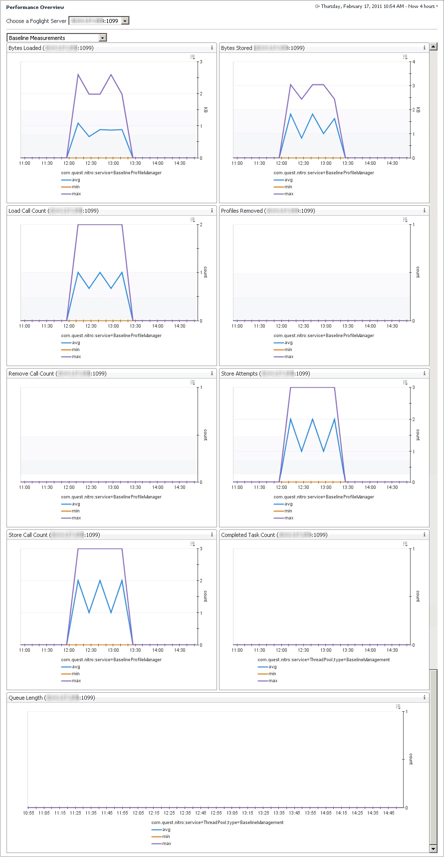 The Baseline Measurements view shows internal database I/O statistics related to baseline computation. A metric baseline is the expected metric range for the given time period. When configured, IntelliProfile computes baselines for metrics, and stores that data in the database.