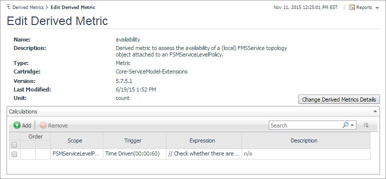The Edit Derived Metric view shows the derived metric settings, such as the derived metric name, cartridge name and version (if applicable), modification date, and the derived metric calculations.