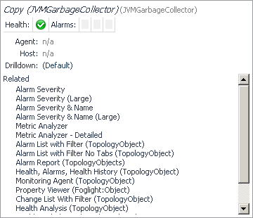 Drill down on an entry in the Object column. Displays a dwell that shows the health of the object instance, identifies any agents or hosts related to this instance, and lists links to views that reference the object instance, including the Property Viewer and Metric Analyzer. From here, clicking a link under Related drills down to the selected view.