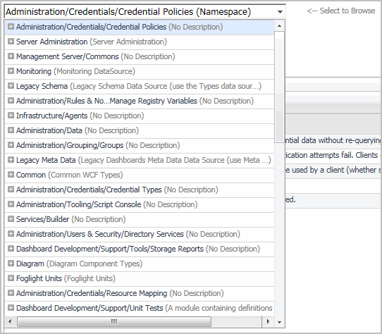 The Schema Browser allows you better understand the database schema. Start by selecting a namespace. A namespace is a collection of types that share the same concept. For example, the Administration/Setup & Support/Blackouts namespace contains a group of types that are used to implement blackouts in Foglight. While type names must be unique within a namespace, it is possible to have same type names across multiple namespaces.