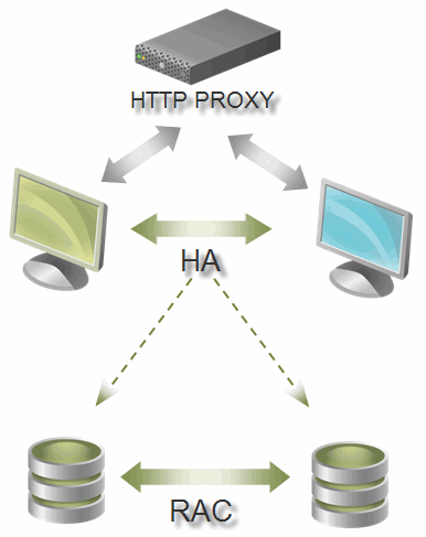 In this configuration, the Management Server was installed on two distinct physical hosts, one acting as HA mode primary, and the other as secondary. This setup was run over an Oracle® RAC cluster to provide HA at the database layer. In addition, an HTTP proxy was configured to provide end users with a single URL for access to the Foglight® browser interface.