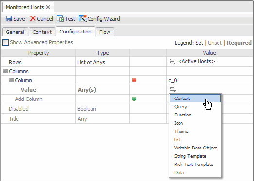 To add columns you use the Configuration tab, but before you do, define a Context to tell the component that it will require an object of type Host for its operation.