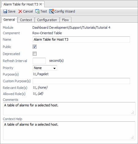 In the Comments and Context Help boxes, type A table of alarms for a selected host.