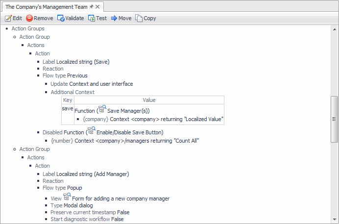The required parameters for Add Manager (company and newManager) are associated with the context keys that supply the required values.