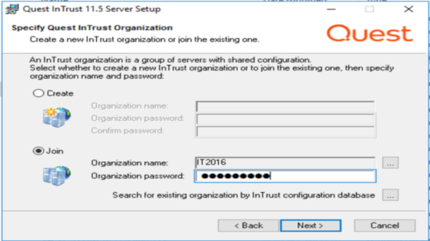 1. While Installing 11.5.1 full suite or Individual server msi, select “join” and click on “Search for existing organization by InTrust configuration database”