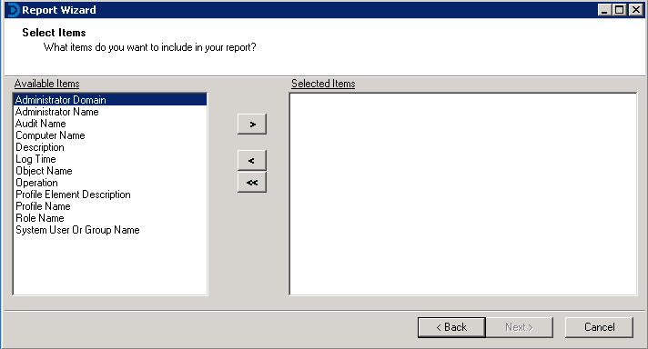 Based on your report category selection, this page of the wizard will present all of the items that correspond to the type of report to be built. Select the items that you want to appear on your report by first, highlighting the field and then click . Click