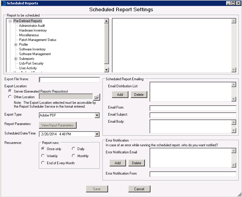 When upgrading Desktop Authority or importing reports from an updated SLI file, parameters from all scheduled reports will become null and void. These parameters must be re-entered for the scheduled report before the report can be successfully executed.