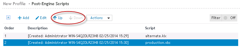As Desktop Authority processes the custom script elements defined by the Pre and/or Post Engine Script list, Validation Logic is applied to each script, beginning with the element at the top of the list. Prioritize the list entries by selecting one or more entries and clicking the Up or Down buttons to reorganize the list.