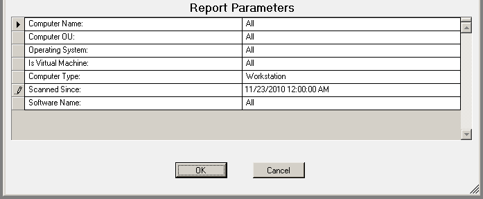 The Software Inventory - Total Installations report prompts the user for the Report Date to include Computer Name, Computer OU, Virtual Machine type, Scanned Since and Software Name.