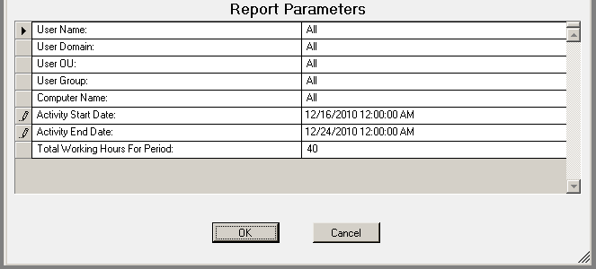 The User Activity report details user activity across multiple computers.  Usage events are grouped by user then by each computer they have logged on to. Total active time is tallied for all computers.  Total active time per session is (login or unlock) to (lock or logoff).  Total inactive time is (total working hours for the time period) (total active time for the time period) (no lower than 0).