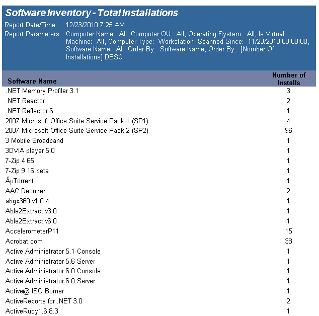 The Software Inventory - Total Installations report reports on data collected regarding installed applications. The report counts the various applications on each desktop based on collected data.