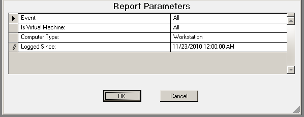 The USB-Port Security - Detailed by User(Fixed Devices) report prompts the user for the Scanned Since date to report on. The report can also be run for All machines, Virtual Machines only or Non-virtual Machines only.